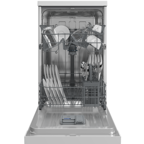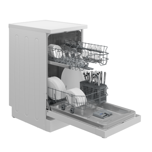 Белая посудомоечная машина Indesit DFS 1A50 с глубиной 60 см оснащена функцией половинной загрузки: можно мыть посуду, если не хотите ждать заполнения всех корзин. Посуду с незначительными загрязнениями можно помыть всего за 30 минут. Для сложных загрязнений есть программа интенсивного мытья при температуре в 70°С. Габариты посудомоечной машины: 85 см в высоту и 44.8 см – в ширину.