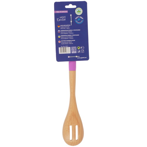 Ручка с нескользящей силиконовой накладкой слабо нагревается и обеспечивает комфортное удержание. В верхней части есть отверстие для подвешивания на крючок. Ложка с прорезями Gipfel Emilie 2873 не царапает посуду, подходит для использования с антипригарными и эмалированными поверхностями.