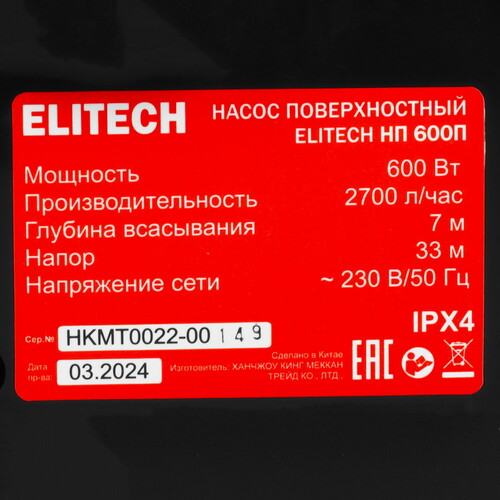Насос поверхностный ELITECH НП 600П (или садовый) предназначен для подачи чистой пресной воды. Может применяться для полива садов и огородов, подъема и перекачивания воды в бытовых условиях, осушения резервуаров. Забор воды может осуществляться из колодцев, открытых водоемов и других источников, с глубины не более 7 м. При этом максимальная температура воды не должна превышать 35°С. Насос не предназначен для подачи воды, содержащей абразивные, длинноволокнистые и химические составляющие. Насос нельзя использовать для перекачивания хлорсодержащей воды, например в плавательных бассейнах.