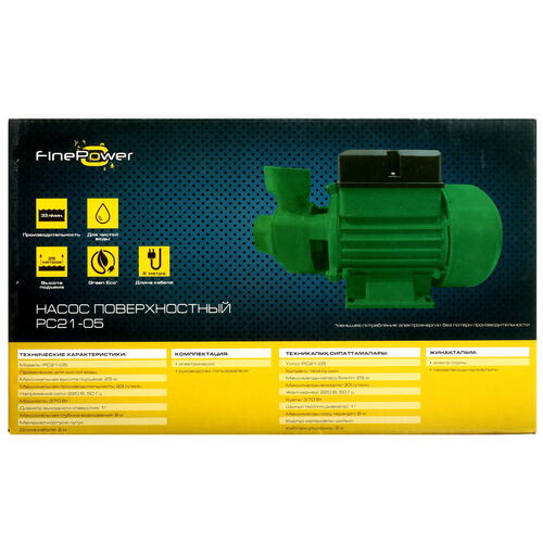 Корпус Finepower PC21-05 выполнен из чугуна, благодаря чему отличается высокой прочностью. Другой особенностью модели является изоляция класса IP44, что обеспечивает дополнительную безопасность при использовании. Питание оборудования осуществляется от сети 220 В, подключение к которой производится при помощи кабеля длиной 2 м. Насос поставляется в фирменной упаковке.