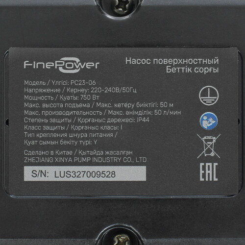 Поверхностный насос FinePower PC23-06 защищен по стандарту IP44, который не допускает негативного воздействия влаги. Производительность достигает 50 л/мин. Забор воды осуществляется на глубине до 8 м. Температура жидкости не должна превышать значение 35 °C. Защитная технология выключает устройство во избежание перегрева.