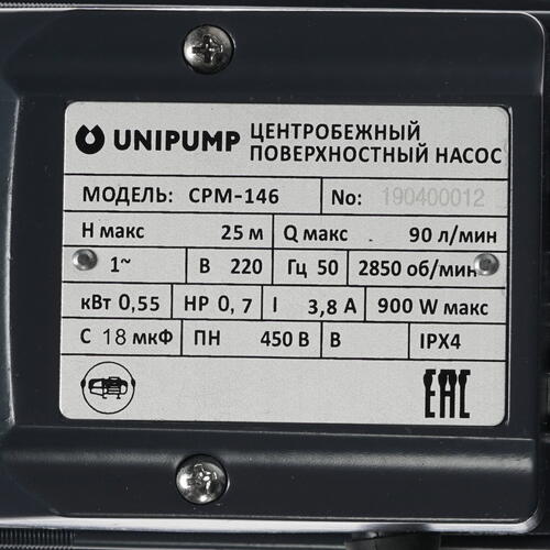 Поверхностный насос Unipump CPM-146 – прибор, предназначенный для подачи чистой воды. Может использоваться в колодцах, скважинах, накопительных резервуарах, а также с источниками открытого типа. Данная модель обладает потребляемой мощностью 550 Вт и производительностью в пределах 90 л/мин. Подъем воды может осуществляться на высоту до 25 м, а максимальная глубина забора воды не должна превышать 4 м.