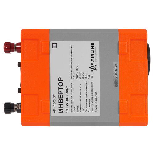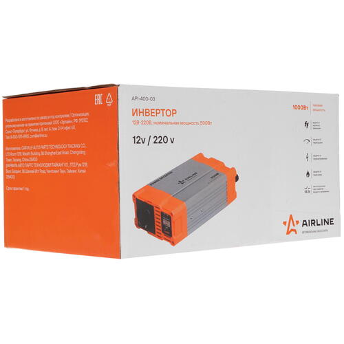 Инвертор Airline API-400-03 выполняет роль автомобильного преобразователя напряжения и позволяет получать переменное напряжение 220 В от бортовой сети 12 В. Тем самым, он предоставляет возможность подключения телевизора, ноутбука, различных инструментов и портативных устройств. Данная модель обладает мощностью до 1000 Вт и надежной алюминиевой конструкцией. Для подключения необходимой техники предлагаются розетка и разъем USB с функцией зарядки. Комплексная система с технологиями защиты от короткого замыкания, перегрева и скачков напряжения повышает безопасность в эксплуатации инвертора Airline API-400-03.