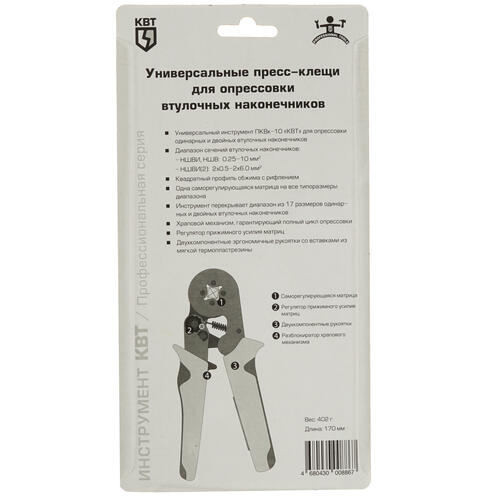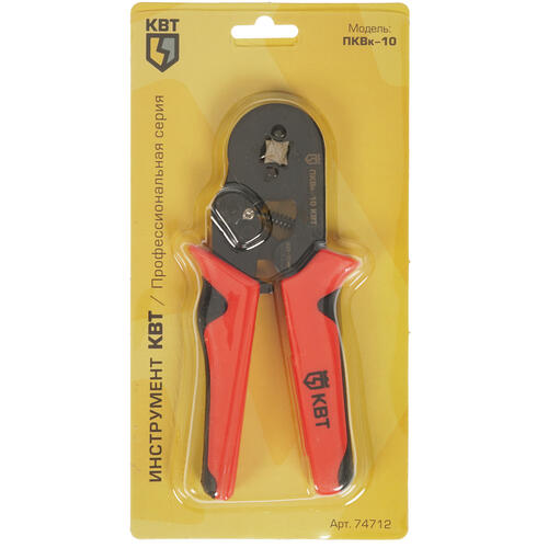 Пресс-клещи КВТ ПКВк-10 74712 подходят для выполнения опрессовки практически всего ряда втулочных наконечников благодаря использованию саморегулирующейся матрицы шириной 13 мм. Храповой механизм обеспечивает блокировку обратного хода до момента завершения цикла опрессовки. Металлическая рабочая часть отличается высоким уровнем устойчивости к неблагоприятным воздействиям и не подвержена появлению коррозии. Для комфортного удержания инструмент КВТ ПКВк-10 74712 оборудован двухкомпонентными рукоятками с удобным радиусом раскрытия.