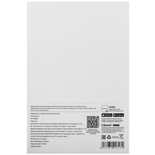 Автономная работа принтера NIIMBOT B1 производится от аккумулятора. Разрешение составляет 203 dpi. Модель поддерживает функцию печати штрих-кодов. Ведущим звеном устройства является термоголовка, которая оставляет след на бумаге в процессе нагрева.