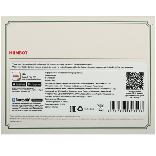 Автономная работа ручного принтера NIIMBOT H1S производится от аккумулятора. Разрешение составляет 203 dpi. Модель поддерживает функцию печати штрих-кодов. Ведущим звеном устройства является термоголовка, которая оставляет след на бумаге в процессе нагрева.
