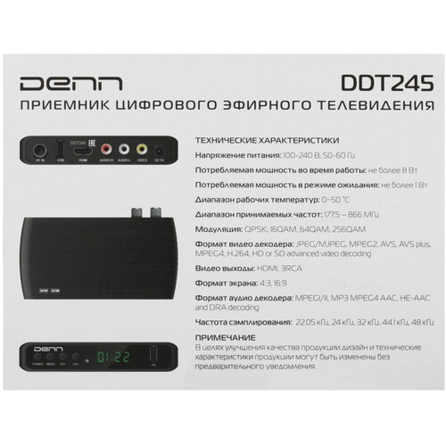В эпоху стремительного развития технологий, когда качество изображения и звука выходят на первый план, DENN DDT245 представляет собой передовое решение для приема цифрового эфирного и кабельного телевидения. Эта приставка открывает перед вами двери в захватывающий мир развлечений, предлагая безупречную картинку и кристально чистый звук, которые преобразят ваш домашний кинотеатр.