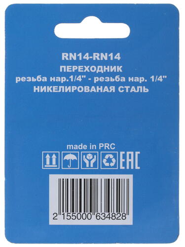 Штуцер Concorde RN14-RN14 играет роль переходника резьба наружная 1/4” – резьба наружная 1/4”. Штуцер поставляется в количестве 1 штуки. Модель упакована в компактный блистер, полупрозрачность которого позволяет ознакомиться с внешним видом содержимого без распаковки. Упаковку удобно хранить на приспособленной для этого вертикальной поверхности, благодаря наличию отверстия для подвешивания.