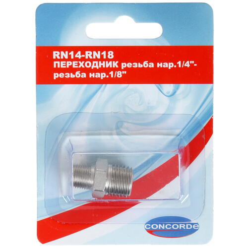 Штуцер Concorde RN14-RN18 – важный аксессуар для оснащения пневматического оборудования. Данное изделие является удобным переходником с резьбы 1/4" на наружную резьбу 1/8”. Устройство обеспечит получение надежного и герметичного соединения, способного выдерживать большое давление при работе.