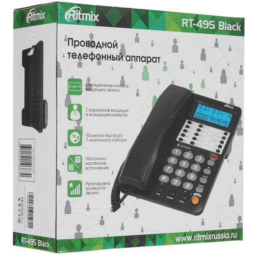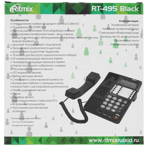Важнейшие дополнительные функции телефона Ritmix RT-495 – повторный набор, определение номера и громкая связь. В числе преимуществ аппарата – часы, календарь, будильник и калькулятор. Телефон поддерживает импульсный и тональный набор. Громкость сигнала вызова можно регулировать. В оснащение телефона входит светодиодный индикатор входящего звонка.
