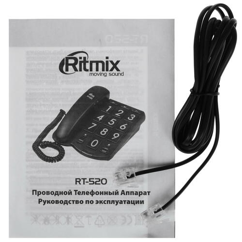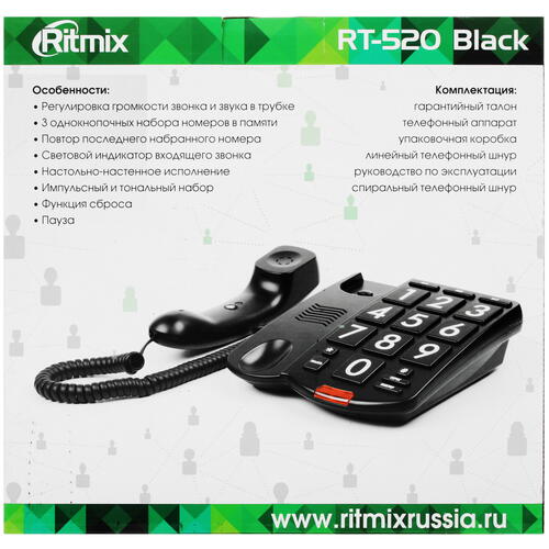 Телефон Ritmix RT-520 оснащен встроенной записной книжкой, рассчитанной на сохранение 3 номеров. Также в этой модели предусмотрено несколько дополнительных функций: повторный набор последнего номера и возможность набора в тональном режиме. Громкость звонка регулируется, как и уровень громкости голоса в трубке.