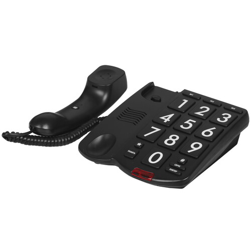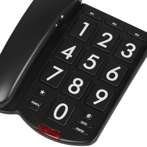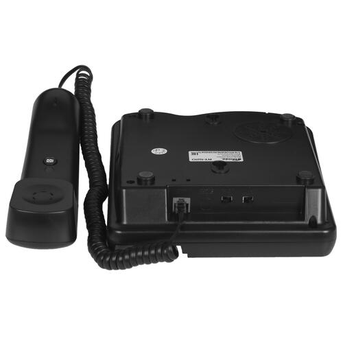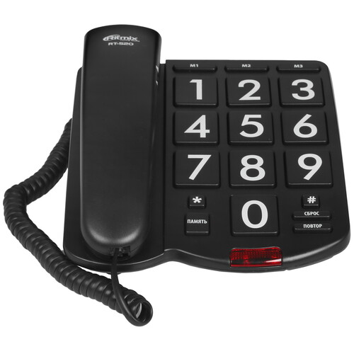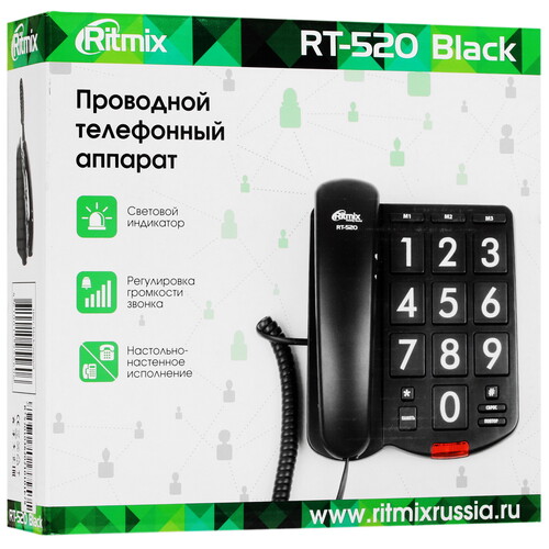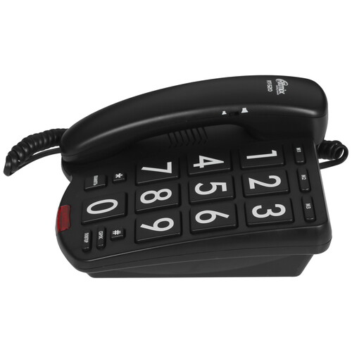 Телефон проводной Ritmix RT-520 оптимально подойдет для пожилых людей. Эта модель выполнена в оригинальном дизайнерском решении и оснащена большими кнопками с очень крупными цифрами. Корпус устройства произведен из пластика и оформлен в черной расцветке. При входящем звонке на корпусе загорается специальный световой индикатор. Универсальная конструкция позволяет расположить такой телефон как на столе, так и на стене.