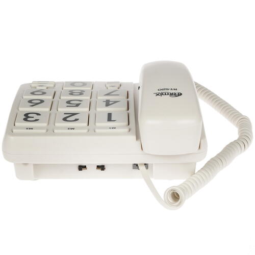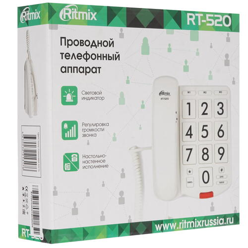 Ritmix RT-520 оснащен тональным и повторным набором номеров, регулятором громкости, кнопкой "Flash" для сброса звонка. Функции определителя номера, автоответчика, журнала вызовов, автодозвона не предусмотрено. Прибор может быть установлен как настольно, так и настенно.