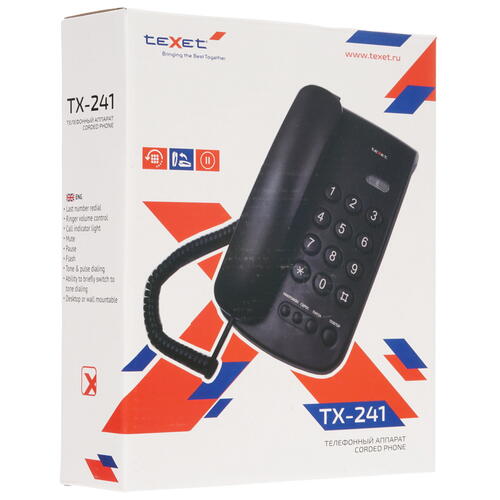 На teXet TX-241 можно настроить уровень громкости звонка, что делает его незаменимым как для большого, так и для малого офисов. Если вы не хотите, чтобы собеседник слышал вашу речь, можно отключить на время микрофон: так вы сможете сохранить звонок и обсудить с начальством нюансы проблемы, обсуждаемой с абонентом. Конструктивные особенности телефона позволяют устанавливать его на столе или зафиксировать на стене.