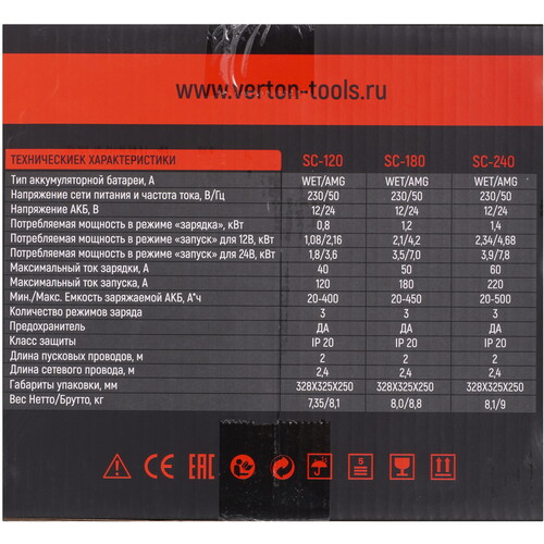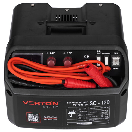Пуско-зарядное устройство VERTON Energy SC-120 используется в быту для зарядки АКБ, а также запуска двигателей транспортных средств с севшими АКБ с диапазоном емкости от 20 до 400 Ач. Устройство применяется в автосервисах и на станциях технического обслуживания, имеет 3 режима заряда, отсек для хранения проводов. Надежный контакт и безопасность обеспечивают мощные зажимы, изолированные термопластичной резиной.