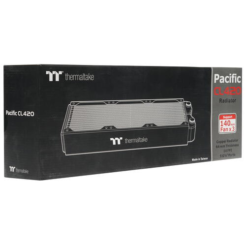 Медный радиатор Thermaltake Pacific CL420 [CL-W193-CU00BL-A] снабжается пятью штуцерами с резьбой G1/4" для присоединения фитингов и шлангов, что обеспечивает его широкую совместимость с прочими компонентами системы охлаждения. Модель с высокой плотностью расположения ребер предусматривает установку трех кулеров размеров 140x140 мм.