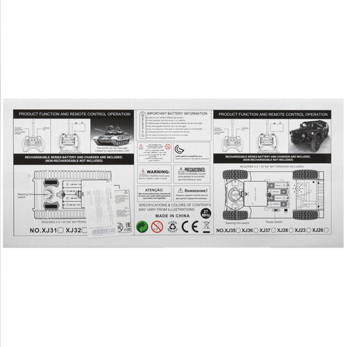 Для работы двигателя машины трофи «Хамер» понадобятся 4 батарейки АА, а для пульта ДУ – 2 элемента питания. Их необходимо приобрести самостоятельно. Удобный и понятный интерфейс пульта позволяет ребенку легко освоить управление автомобилем. Радиус действия сигнала от пульта составляет 15 м, что обеспечивает маневренность машины.