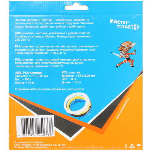 Картридж выполнен из ABS-пластика, который известен своей высокой прочностью, а также устойчивостью к воздействию самой агрессивной среды. Такой пластик безопасен с точки зрения его экологичности. Длина нити Мастер-Пластер составляет 45 метров, толщина – 1.75 мм.