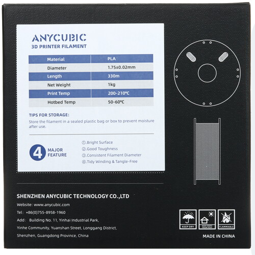 Anycubic PLA подходит для филаментной печати по технологии послойного нанесения. Плавление нити происходит при температуре нагрева в экструдере в диапазоне 200-210 °C. Пластик PLA не выделяет резкого химического запаха и подходит для печати в домашних условиях. Материал обладает небольшой усадкой и может использоваться для создания крупных деталей. PLA не требует сложной настройки 3D-принтера, наличия термокамеры и стола с подогревом.