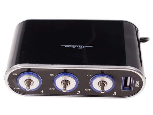AIRLINE ASP-3S-15 поддерживает одновременную работу до 4 устройств, среди которых 3 можно подключить через стандартное гнездо прикуривателя, а одно – через USB-вход. Гнезда со стандартным интерфейсом имеют индикаторы, отображающие текущее подключение устройств. Кроме того, присутствуют отдельные тумблеры для каждого устройства. Выходная мощность разветвителя – 60 Вт. Выходная сила тока составляет 5 А для гнезд автоприкуривателя и 1 А для USB.