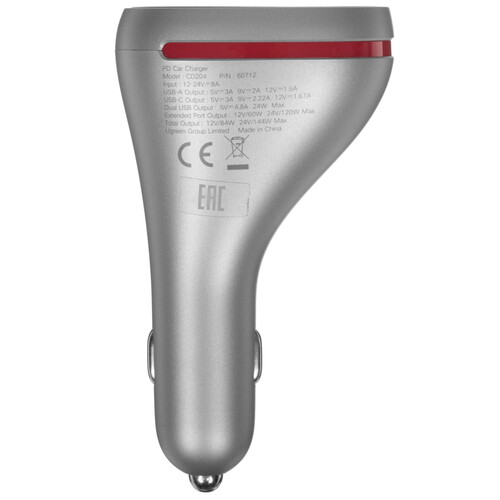 Основная особенность Ugreen CD204 это наличие сквозной розетки прикуривателя (60 Вт), тем самым розетка остается не занятой и можно питать, к примеру, видеорегистратор не подключая разветвитель. У модели CD204 два порта для зарядки смартфонов с общей мощностью 24 Вт и поддержкой быстрой зарядки QC 4.0, PD и AFC. Дизайн зарядного устройства оживляет красный кольцевой индикатор работы.
