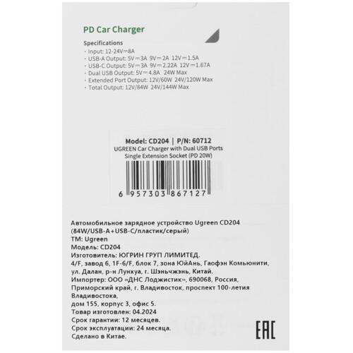 Разветвитель автоприкуривателя Ugreen CD204 [5454082]