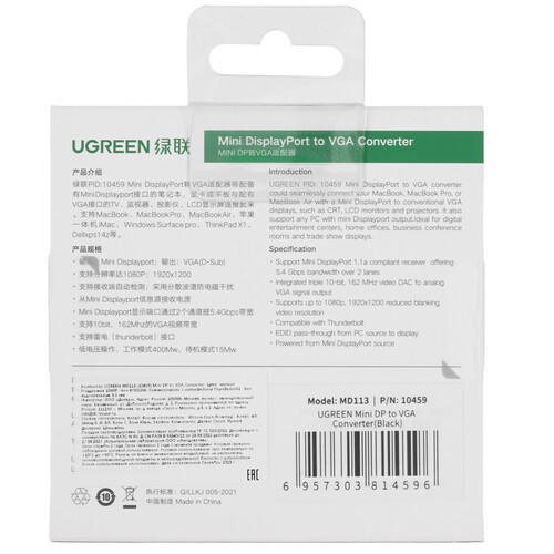 Конвертер Ugreen MD113 предназначен для подключения ПК с mini DisplayPort к телевизору, монитору или проектору с разъемом VGA. Он отлично подходит для оптимальной передачи видео сигнала и устойчив к коррозии.
