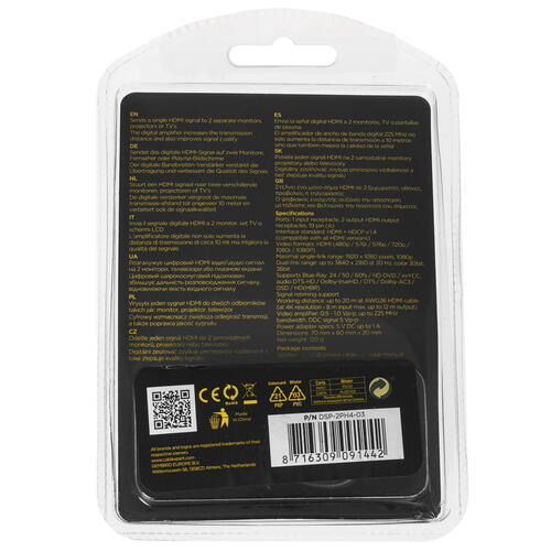 Разветвитель HDMI Cablexpert DSP-2PH4-03 разветвляет цифровой HDMI видео\аудио сигнал на 2 монитора, телевизора или плазменных экрана. Цифровой широкополосный усилитель увеличивает дальность распространения сигнала, восстанавливая качество входного сигнала. Имеется поддержка поддержка 3D-видео.