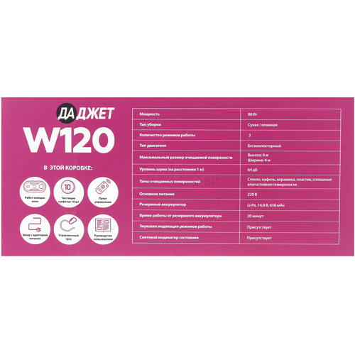 Робот-мойщик окон Даджет W120 в корпусе белого цвета – это довольно производительное и удобное устройство, способное облегчить уборку. С его помощью можно легко мыть или просто протирать большие по размерам окна (4x4 м). Помимо этого робот отлично справляется с очищением кафельных, керамических, пластиковых и других влагостойких, сплошных поверхностей. Всего у робота предусмотрено 3 рабочих режима, регулировка которых выполняется с пульта ДУ. В процессе работы устройство издает тихий (64 дБ) шум.