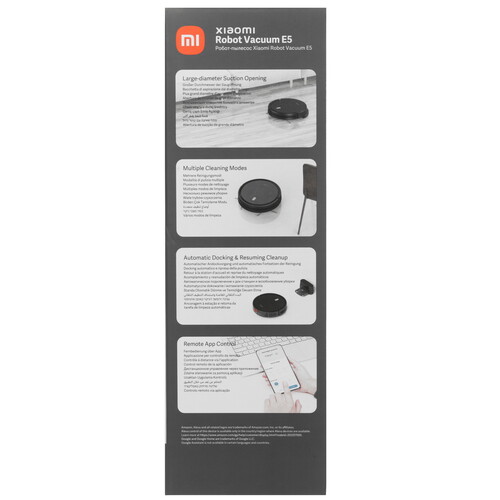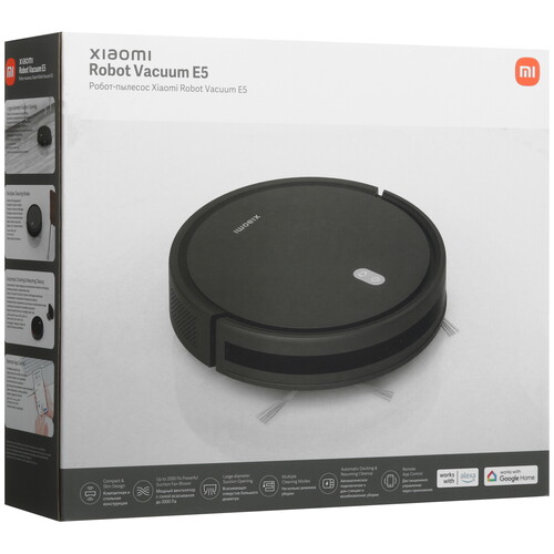 Робот-пылесос Xiaomi Robot Vacuum E5 в корпусе черного цвета имеет фильтр HEPA 10 для удаления пыли из воздушного потока. Модель оснащена контейнером объемом 90 мл для проведения влажной уборки. Управление функционалом осуществляется через приложения Mi Home и Xiaomi Mi Home, а также голосовых ассистентов.