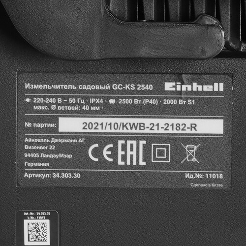Техника Einhell GC-KS 2540 оснащена удобным толкателем для безопасной работы. Откидная загрузочная воронка с замком не позволит веткам при измельчении вылететь наружу. Прибор подключается к обычной розетке 220 В.