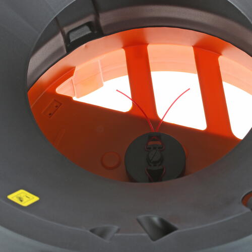 Металлический корпус садового измельчителя Worx WG430E устанавливается на специальную подставку в виде треноги. В его нижней части фиксируется мешок для сбора измельченных травы и листьев. Система измельчения представляет собой закрепленную специальным способом триммерную леску толщиной 2.3 мм. Она вращается со скоростью 8500 об/мин, благодаря чему процесс измельчения происходит максимально быстро. В случае изнашивания лески ее можно легко заменить. Для этого в комплекте с измельчителем имеется набор лески из 7 штук.