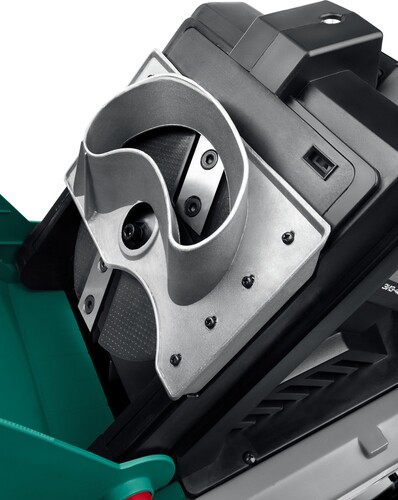 Сборник для травы имеет емкость 50 литров. Максимальный диаметр помещаемых веток не должен превышать 40 мм. В набор поставки входит толкатель. Он позволит направить отходы к режущей системе, не рискуя при этом получить травму.