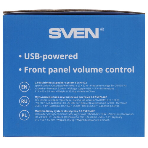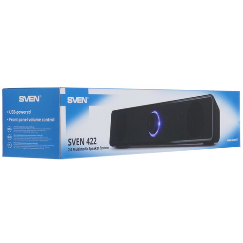 Саундбар SVEN 422 с корпусом черного цвета позиционируется как компактная акустическая система для ПК или телевизора. Звуковая панель с продолговатым корпусом является удобной альтернативой более габаритным и тяжелым комплексам с настольными колонками. Стереосистема весом 355 гр. оснащается двумя встроенными динамиками, работающими по звуковой схеме 2.0. Суммарная мощность динамиков саундбара с корпусом из пластика – 6 Вт.