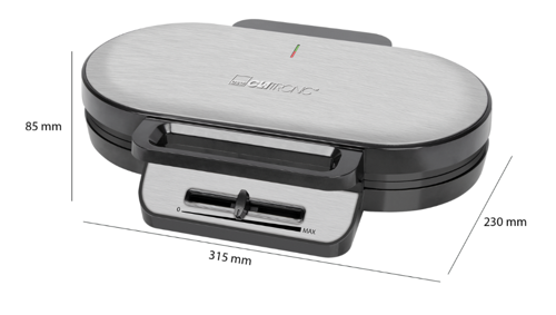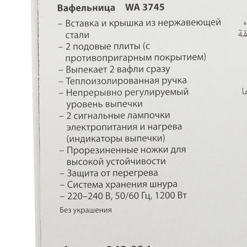 Модель Clatronic WA 3745 дополнена антипригарным покрытием, гарантирующим получение красивой и вкусной выпечки. Прибор действует с мощностью 1200 Вт и дополняется надежной защитой от перегрева. Корпус оснащен небольшим отсеком для удобного хранения кабеля. Устройство весит 2.42 кг и обладает размерами 31.5x8.5x23 см.