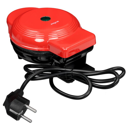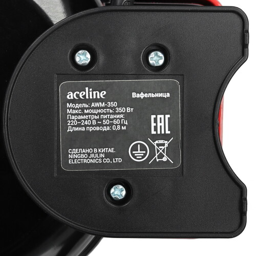 Вафельница Aceline AWM-350 выполнена в красном пластиковом корпусе с визуальным индикатором и нескользящими ножками. Конструкция допускает вертикальное хранение устройства с наматыванием кабеля в специальном отсеке. Длины шнура 1 м хватает для подключения вафельницы к розетке рядом с кухонным столом.