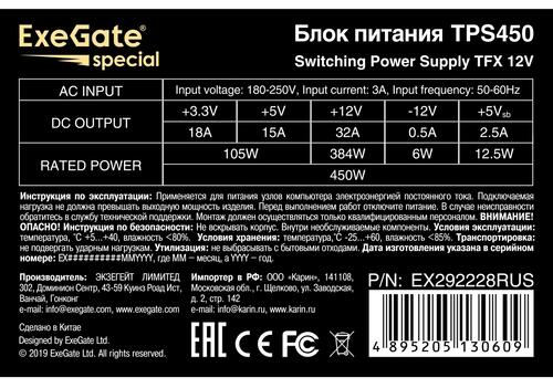 Блок питания ExeGate TPS450 предназначен для обслуживания системного блока, в котором реализована поддержка источников питания форм-фактора TFX. Данная модель отличается номинальной мощностью 400 Вт. Возможности подключения представлены разъемом 20 + 4 pin для платы, разъемом 4pin для процессора, 3 разъемами SATA для накопителей, а также разъемами Molex. За эффективное рассеивание теплого воздуха отвечает вентилятор диаметром 80 мм. Комплексная система защиты гарантирует стабильную и надежную работу ExeGate TPS450 при различных вычислительных нагрузках.