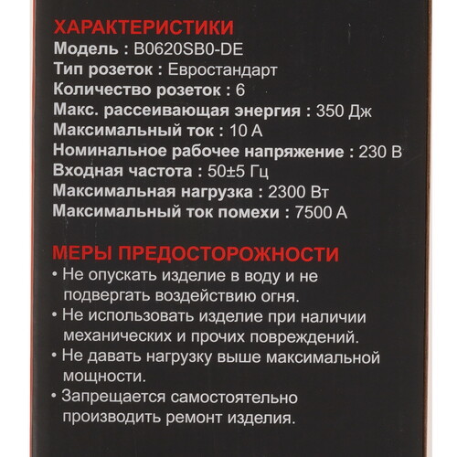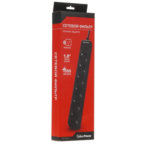 Сетевой фильтр CyberPower B0620SB0-DE с автоматическим предохранителем защитит подключенную электрическую технику от перепадов напряжения, импульсных и высокочастотных помех, перегрузки в электрической сети. Данная модель оснащена 6 розетками стандарта евро и общим выключателем, который позволяет одним нажатием предотвратить подачу питания на розетки. Из других особенностей CyberPower B0620SB0-DE отмечаются сетевой кабель длиной 1.8 метра и корпус из термостойкого пластика.