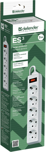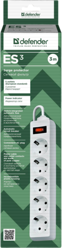 Defender ES – это не только разветвитель и удлинитель, но еще и надежная защита от импульсных помех. В случае возникновения опасных перегрузок или короткого замыкания автоматический предохранитель отключает подачу электричества, предупреждая повреждение подключенных приборов. Все проводящие элементы выполнены из меди, для других деталей используется негорючий пластик.