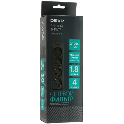 Сетевой фильтр DEXP Standard 418B рассчитан на максимальную мощность 2400 Вт, для стабильной работы нагрузка не должна превышаться. Длина кабеля для подключения к сети составляет 1.8 м, что позволяет расположить устройства на относительном удалении от розетки. На корпусе есть общий выключатель, который прекращает подачу питания на пилот.