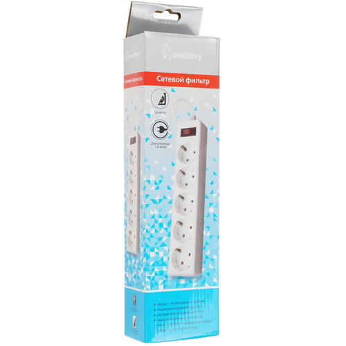 Сетевой фильтр Smartbuy SBSP-18-W белого цвета имеет 5 евророзеток с общей максимальной подключенной нагрузкой до 2.2 КВт. Модель защищена от импульсных помех, короткого замыкания и перенапряжения. Общий выключатель разом обесточивает все розетки. Автоматический предохранитель размыкает цепочку питания при резком скачке напряжения.