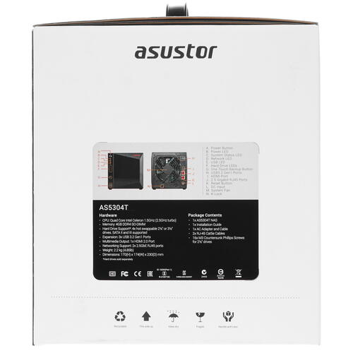 Сетевое хранилище Asustor Nimbustor 4 оснащено мощным процессором Intel с ОЗУ 4 ГБ. Оборудование позволяет устанавливать до четырех накопителей с форм-фактором 2.5” или 3.5” и объемом каждого диска до 16 ТБ. Предусматривается возможность горячей замены HDD, что значительно упрощает эксплуатацию. Комфортной и безопасной работе способствует наличие эффективной системы охлаждения.
