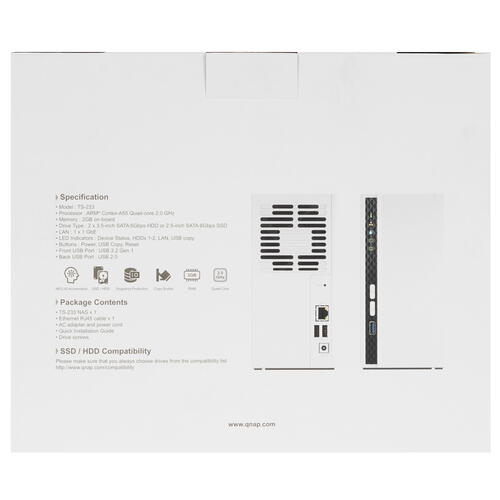 Сетевое хранилище (NAS) QNAP TS-233 займет достойное место в вашем рабочем кабинете дома или в офисе. Устройство обеспечивает комфортный и безопасный удаленный доступ к большому объему данных. Хранилище рассчитано на установку пары SATA-накопителей, объем каждого из которых ограничен существенными 22 ТБ. Можно использовать не только жесткие диски, но и SSD. Хранилище совместимо с накопителями 2.5-дюймового и 3.5-дюймового форм-факторов. Допускается организация RAID-массивов уровней 0 и 1. Также возможно использование массива JBOD и режима Single disk. Хранилище поддерживает функции IP-видеонаблюдения и сервера FTP.
