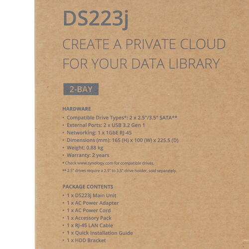 Сетевое хранилище (NAS) Synology DiskStation DS223j предназначено для резервного копирования и удаленного доступа к данным. Устройство рассчитано на настольную установку. Хранилище подходит для размещения 2 накопителей SATA, объем каждого из которых ограничен 16 ТБ. Поддерживаются массивы Synology Hybrid RAID, RAID 0, RAID 1 и JBOD. В режиме Basic используется единственный накопитель.