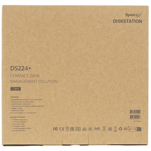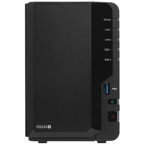 Сетевое хранилище (NAS) Synology DiskStation DS224+ ориентировано на малый бизнес и домашних пользователей. Функции устройства – резервное копирование и удаленный доступ к данным. Модель рассчитана на установку 2 накопителей SATA, объем каждого из которых может достигать 16 ТБ. Поддерживаемые форм-факторы – 2.5 и 3.5 дюйма. Возможно использование жестких дисков и твердотельных накопителей.