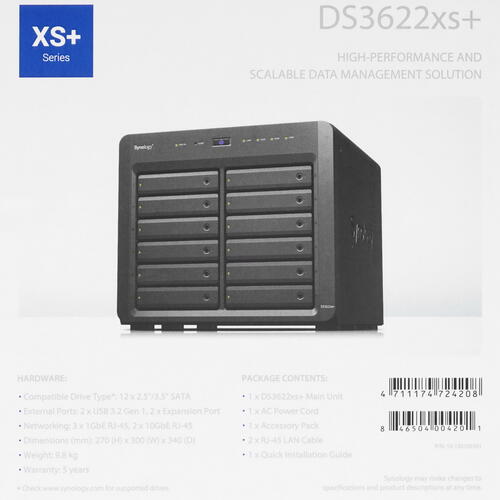 Сетевое хранилище (NAS) Synology DiskStation DS3622xs+ в черном настольном корпусе подойдет для применения в корпоративной среде и предоставляет 12 отсеков для установки 2.5- и 3.5-дюймовых накопителей, объем каждого из которых может достигать 18 ГБ. Диски можно отключать и подключать без остановки устройства. Если вам требуется устройство для хранения большого количества программ, документов и мультимедиа, доступ к которым поддерживается по локальной сети или через Интернет, данная модель станет удачным решением.