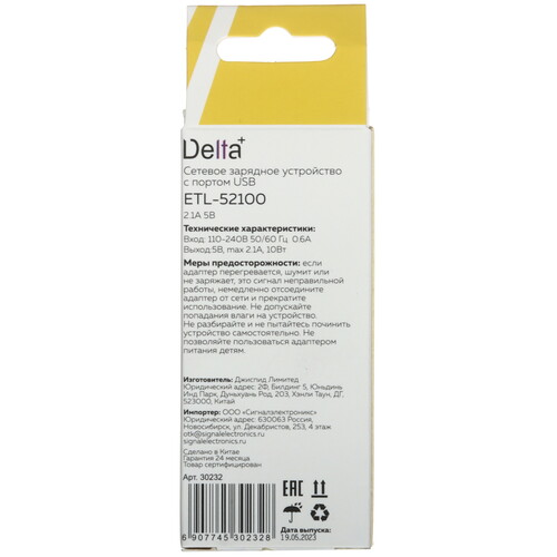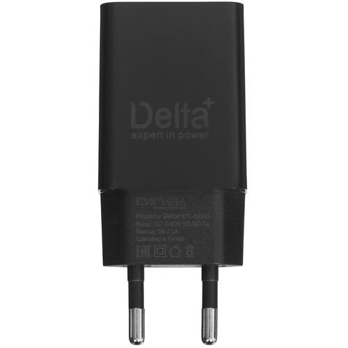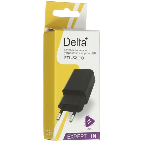 Сетевое зарядное устройство Delta+ ВETL-52100 в черном цвете обеспечивает мощность 10.5 Вт и силу тока 2.1 А. Оно поддерживает напряжение до 5 В и поставляется без кабеля.