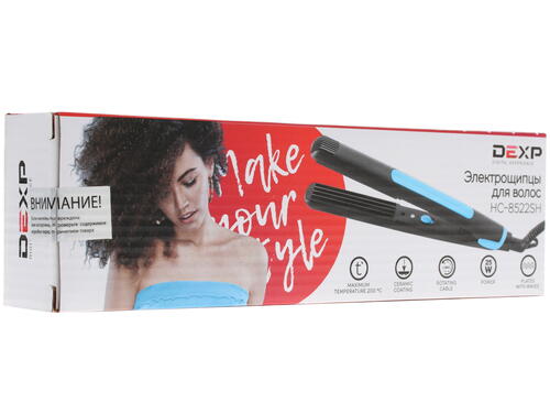 Щипцы для завивки волос DEXP HC-8522SH располагают одним температурным режимом - нагрев пластин осуществляется до 200 градусов. Керамическое покрытие пластин, размер которых равняется 22x85 мм, гарантирует равномерное распределение тепла по всей их поверхности и бережное отношение к структуре волоса. При использовании данного прибора ваша прическа будет состоять из средних волн-гофре. Двухметровый шнур свободно вращается вокруг своей оси, благодаря чему в процессе создания укладки ваши движения не будут скованны.