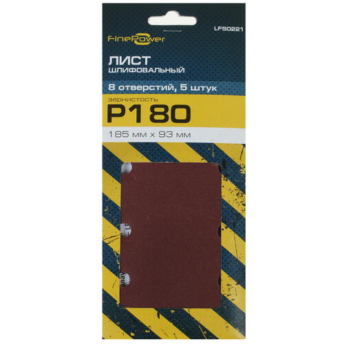 Шлифовальный лист FinePower LFS0221 предназначен для совместного использования с вибрационными шлифовальными машинками. Благодаря возможности обработки различных материалов (дерево, пластик, краска, металл, шпатлевка) он является универсальной оснасткой. Абразивная поверхность с зернистостью P180 обеспечивает высокую эффективность шлифования и отличается стойкостью к износу. Основой листов является плотная износостойкая бумага (велкро-липучка). В конструкции листа имеется 8 отверстий для быстрого отвода пыли и отходов. В наборе FinePower LFS0221 поставляются 5 листов с размерами 185x93 мм.