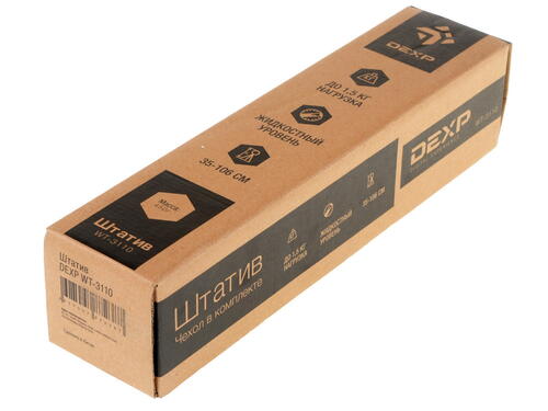 Модель DEXP WT-3110 имеет раздвижную штангу. Это позволяет изменять высоту штатива от 35 см до 106 см. Ровное положение устанавливаемой техники можно обеспечить за счет встроенного жидкостного уровня. Съемная штативная головка с крепежным винтом совместима с любыми брендами техники. Дополнительно в комплекте предусмотрен чехол для переноски.